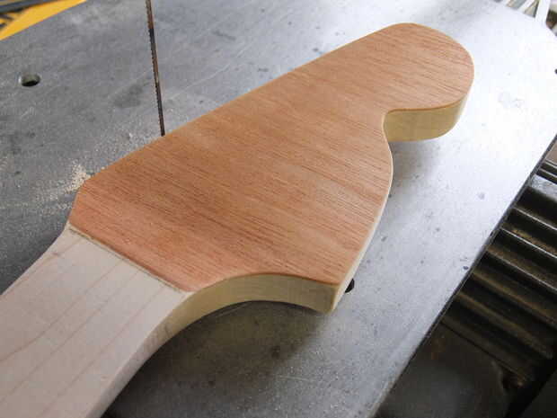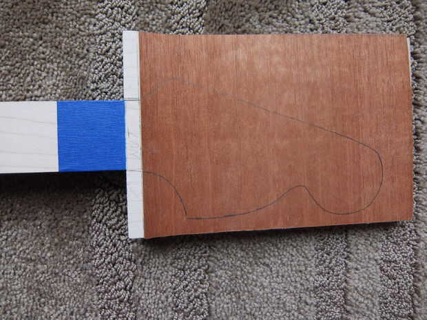 Tomar su diseño impresionante cabezal y trazar sobre la paleta del clavijero y cortar con una sierra de marquetería, Sierra caladora o sierra de contornear. Los bordes de la arena y la pluma en el perfil del cuello usando 4-en-mano.