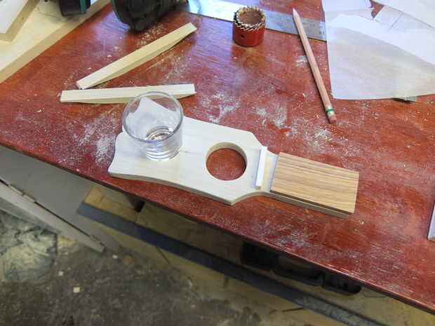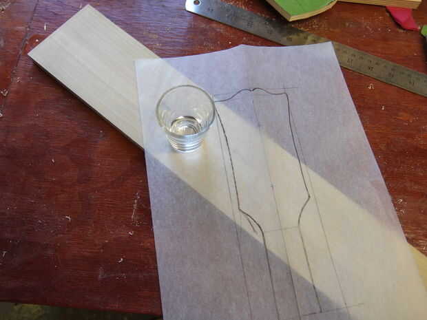 Medir el ancho y la profundidad de la caja y extraer una forma de paleta en un pedazo de papel. Corte la forma para crear un patrón de plantilla. Transferencia de esta forma a una pieza de madera de 0,25" y cortar con una sierra caladora o sierra de marquetería y arena. Se trata de su servidor de tiro. Cortar dos agujeros grandes en la pala para sujetar los vasos de chupito. Debe deslizar la pala en la caja de lado como un estante. Marca donde la paleta se encuentra dentro de la caja. Corte algunos "soportes" para mantener la paleta en su lugar y deje que se deslice hacia adentro y hacia afuera. Estos soportes en su lugar en las marcas del pegamento y la abrazadera.