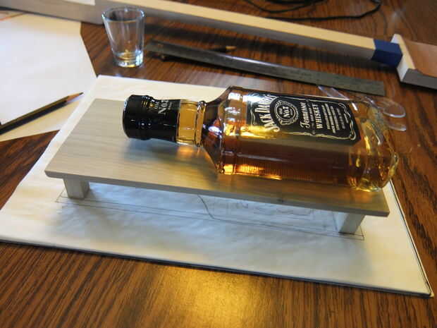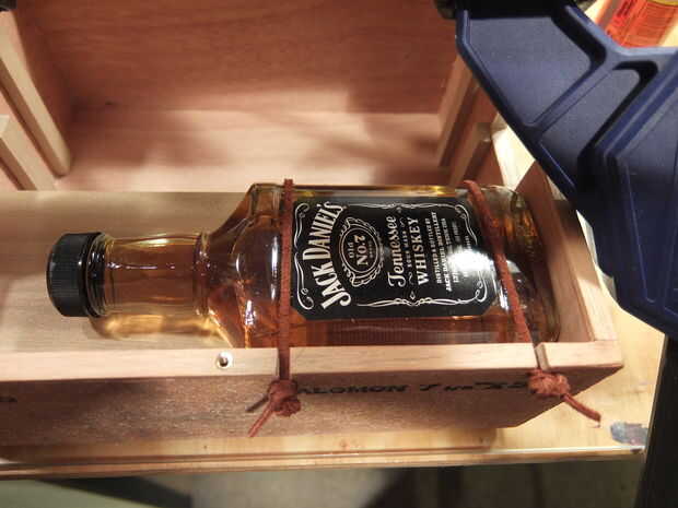 Seco ajuste la Junta del cuello a la caja. Encontrar un lugar dentro de la caja donde la botella de licor se forma y puede ser quitado. Puede que necesite orientar de diferentes maneras para conseguir que se ajuste. Puede adaptarse a ambos lados del cuello; que tenga que colocarse detrás del cuello. Pero para que quepa allí mientras sigue permitiendo el cuadro cerrar. Utilizar algunos restos de madera para construir una plataforma pequeña para él sentarse si tienes que. Puede que necesite elevar la plataforma un poco con algunos apoyos de madera. Pegamento en el lugar y la abrazadera.