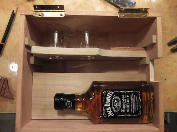 Ahora usted debería ser capaz de almacenar la botella, copas y servidor completamente dentro de la caja, completamente escondido de su esposa.