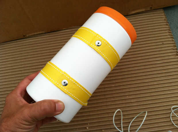 Este es un bolso hecho de una bolsa de alimento de animal doméstico forrada con algodón blanco y viejo manijas hoja y cinta. Los mejores a utilizar están hechos de una fibra de plástico. También se puede utilizar un tipo de papel que plancha una plan