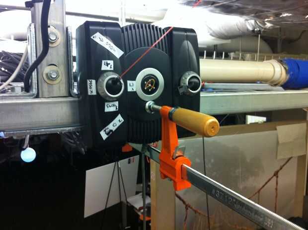 El Gametrak (http://en.wikipedia.org/wiki/Gametrak) es un controlador USB que detecta posiciones en el espacio 3-dimentional. La conexión USB es muy hackeable para la posición espacial de detección ya que cuenta con dos sensores de posición de 3 ejes con potenciómetros de cadena accionada por resorte. Perfecto! Sólo te rastreamos el eje z de una perilla, pero va a ser lo que necesitamos.