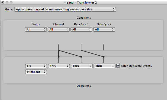 Inicialmente, los eventos específicos noteoff llevaron a corromper meta datos convertidos directamente a un evento de curva de pitch. Por lo tanto, usted necesitará crear un transformador que convierte la inicial entrados datos de ControllerMate están un evento de control. Esto tiras los datos extraños.