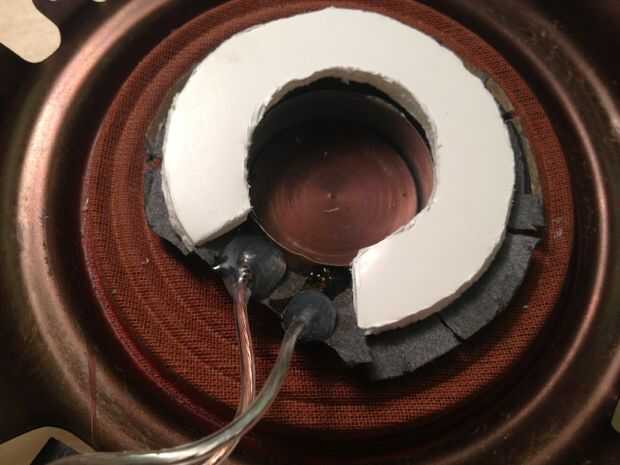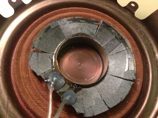 Para hacer una base robusta que plana, corte ranuras en el borde de papel restantes 2 centímetros aparte. Pegamento caliente espuma base "C" forma directamente en este documento. (Tenga en cuenta que el alambre fino de nuestro altavoz vintage se rompió, así que puentea los terminales y caliente pegado nuestros cables de altavoces directamente a los conductores. Más suerte la gente no tiene que hacerlo).
