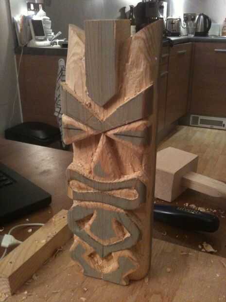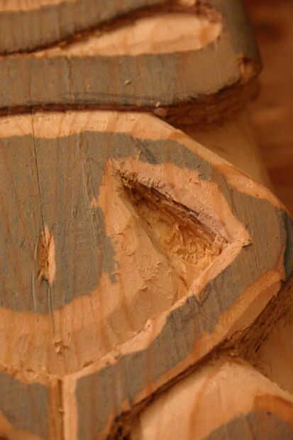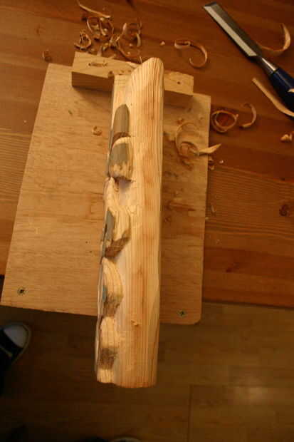 Tallada en la parte de atrás y me echó a un lado del bloque un poco para darle una sensación más tallada-de-bienes-árbol. Más profundos tallados piezas quedaron aproximadamente tallada para darle más de una sensación de la edad de piedra, mientras que el detalle destacado fue más finamente tallado. Un buen cincel agudo puede dejar una superficie muy lisa y es mucho más rápido que el papel de lija! La mayoría de la pintura original fue quitado como esta. Da un mejor acabado para un menor esfuerzo y tiempo de lijado.