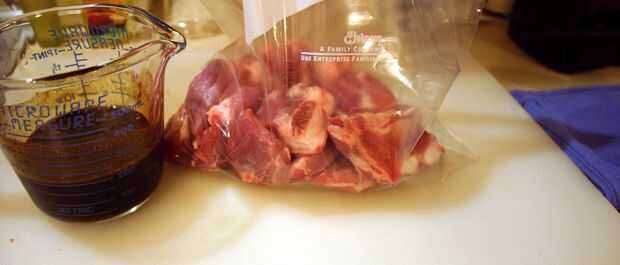 Vierta el adobo sobre la carne en la bolsa y sellar herméticamente, exprimiendo todo exceso de aire de la bolsa. Puede mover la bolsa para asegurarse de que la marinada se distribuye uniformemente.