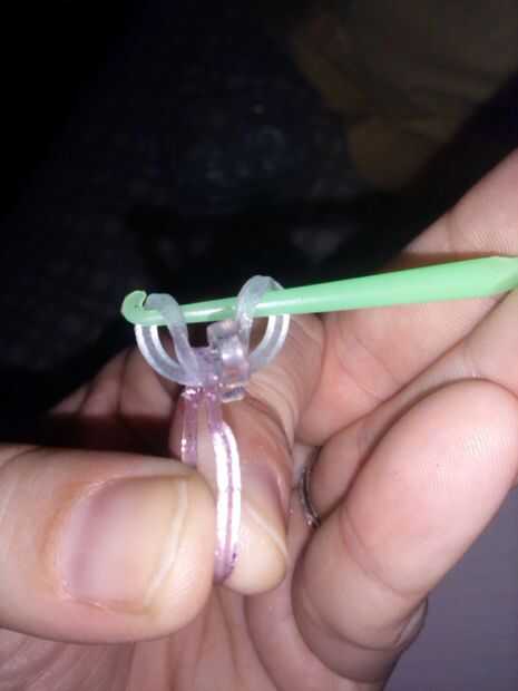 Retire la herramienta del gancho especial y pase a través de ambos lazos de la goma azul. Asegúrese de que nunca torcer la cinta de goma o se verá raro.
