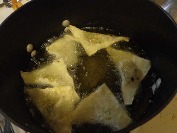 Esta receta es básicamente una bola de masa hervida China hecha de pieles de won ton (hojas delgadas de papel de masa hecha de harina, huevos y sal). Pero en Indonesia, esta cocina es conocida como Pangsit Goreng.Pieles son llena con la mezcla de car