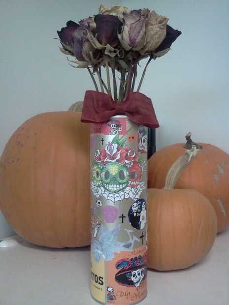 I realmente como día de los Muertos. Yo he coleccionado piezas durante los años de todas partes. Quería algo para poner mis rosas secas en que trabajaría también en mi colección. Pensé en decorar una lata vacía de Pringles que comía fuera de en el tiempo. Las ideas crecieron a partir de ahí. No tienes que usar una lata de Pringles, tal vez usted es un jugador de tenis y latas vacías de las pelotas de tenis. Las posibilidades de reasignación algo es ilimitada, así que use su imaginación. Hoy sin embargo, estamos utilizando una lata de Pringles