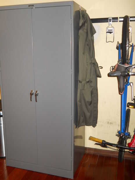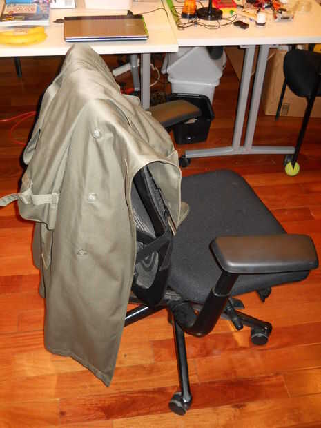 Por lo tanto, ahí estaba, al llegar a la oficina en una mañana lluviosa, con mi gabardina mojada, pensando en los bellos y baratos paraguas que vi en Chinatown (pero NAAAH! Mi avaricia no me deja comprar uno!), cuando me doy cuenta de que no hay lugar en el laboratorio de Instructables donde puede colgar su capa de foso. O el abrigo de la lluvia. Y no puedo abrir un agujero en la pared para poner un clavo para mi abrigo. Así que, ¿qué haría MacGyver?