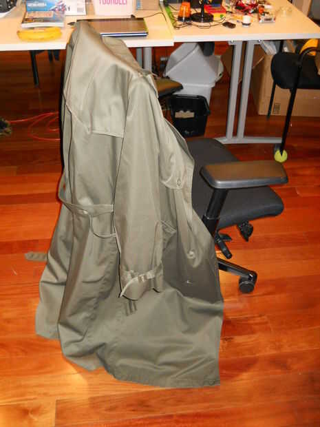 ¿Pero mi gabardina tiene un problema: donde colgar al llegar a la oficina y saca? Trench coats son tan grande y tan de largo. Y se empeora en tiempo de lluvia. La trinchera se moja y se puede poner en una silla, sin mojar la silla o arrastrando su capa en el suelo.