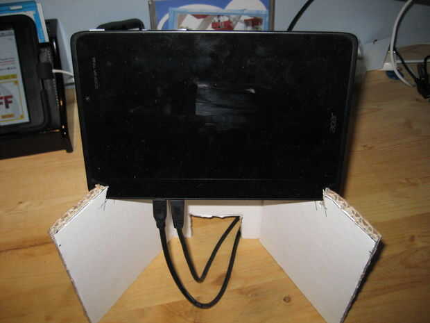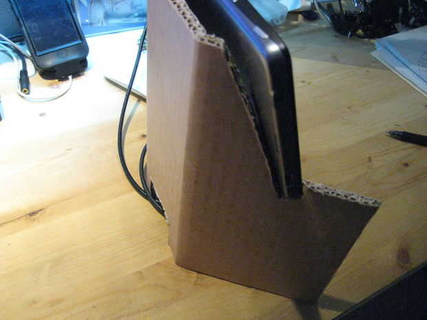 Una tira de cinta adhesiva funciona bien como una estructura de tensión entre los dos lados de los ángulos. También puede doblar la cinta por la mitad (con la excepción de los extremos) para que los cables y otros cruft de escritorio no se pega a la parte posterior de la cinta.