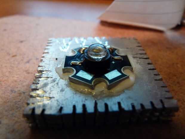 montar el LED en el centro del disipador de calor con una cantidad pequeña y uniformemente extensión de grasa compuesto termal. Lo que hice fue extender una pequeña gota sobre el disipador de calor de aluminio, colocar el LED en la parte superior y el LED se arremolinan en un círculo hasta que la grasa se distribuye uniformemente.