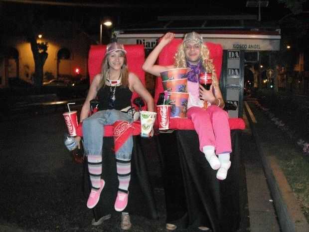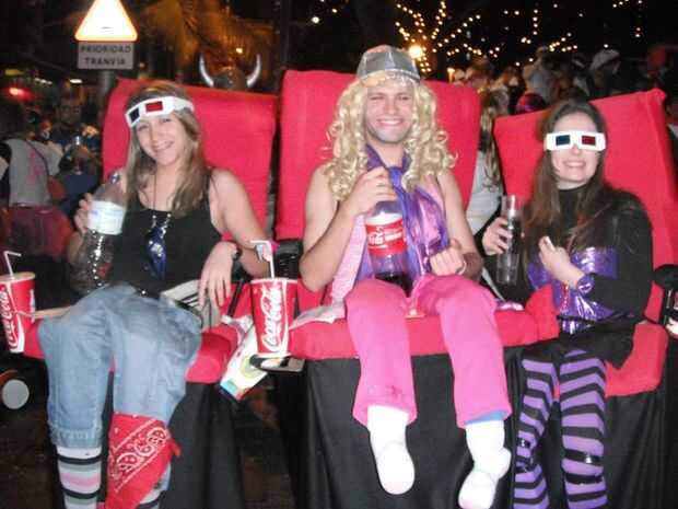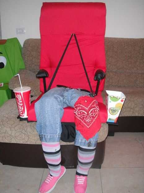 Necesitaras madera fina, o cartón resistente. Unelo en forma de L con una escuadra y pegamento. Compra espuma de 5mm de espesor y tela. Y tapiza el asiento con ayuda de una grapadora. En la parte de abajo de la estructura realiza un circulo por donde meter el cuerpo y colocale unos tirantes. para que no se vean tus piernas, rodea toda la estructura con tela negra. Ya solo te queda hacer unas palomitas y listo! a disfrutar