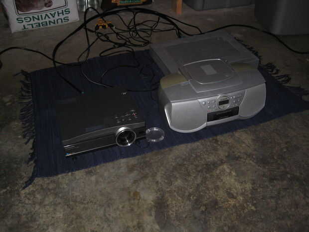 Todo lo que se necesita para el sonido es un boombox Aiwa antiguo.  El garaje vacío amplifica el sonido mucho así que no es necesario alta amplificación.  Suena genial!