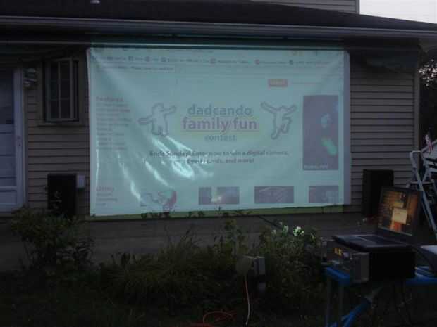 El tiro con la proyección de la página web fue tomado así como el sol. No muy oscuro lo suficiente para ver películas, pero da una idea del tamaño. En este ejemplo, la pantalla fue en la TV generalmente relación 4:3, por lo que cortaron la parte superior e inferior. Siempre utilizo formato widescreen/adaptado para el cine, así que utilizo el ancho total de 12', pero no cortar la parte superior o inferior.