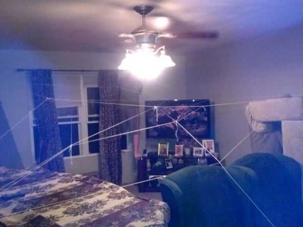 Sería la mejor manera de hacer la cinta con la línea de mampostería, pero haremos pesca cadena o cuerda. Para hacer las mantas estable y evitar la flacidez es mejor empezar la primera longitud de cadena de un ancla fuerte de punto; un sofá o silla es perfecta. La primera longitud par de cadena debe espaciar uniformemente y en los lugares donde se necesite fuerza extra. (La TV sí mismo es perfecto para uno de estos soportes, sobre todo si tienes una pantalla plana con una base fuerte y un marco. También sería perfecta para prevenir la obstrucción de la TV.) Después de la mayoría de la zona en la que se necesita un techo es cubierta, se debe utilizar más cadena para sujetar de las longitudes ancladas a todos los otros pedazos de cadena. Después de esto no debe ser espacios donde las mantas sag o no sean compatibles.