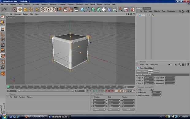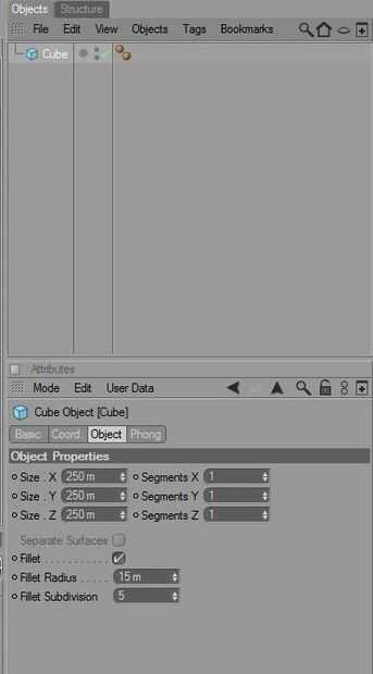 2. en la esquina inferior derecha de la pantalla, debe haber una ventana etiquetada atribuye que contiene cuatro fichas diferentes: básica, Coord., objeto y Phong. Asegúrese de que se resalte la ficha con la etiqueta de objeto. Establecer los valores de tamaño de X, Y y Z 250 (Foto 2).