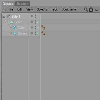 5. en la jerarquía bajo la pestaña objetos, verá objetos booleanos, cubo y esfera. Para hacer el punto, haga clic y arrastre la esfera en el boole, por lo que es un objeto secundario de la boole.