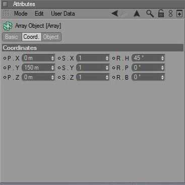 5. en el administrador de atributos (con el objeto de matriz seleccionado), destacan la Coord. ficha, cambio la posición 150 y cambiar el giro X 45 (Foto 3).