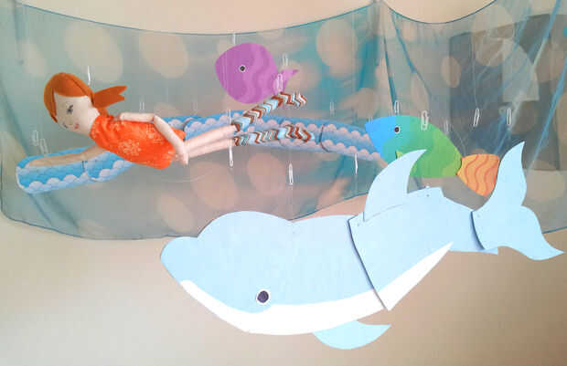 Colgar un telón de fondo de escenario (aka mi bufanda), algunas nubes puffy (relleno polivinílico), o lo que adapta a su fantasía y el espectáculo comienza. Necesidad de ocupar todos 32 colgante puntos, no enganche simplemente los no utilizados en los clips anteriores. Utilice el control deslizante vertical para el espectáculo vuelo y la manivela circular para el espectáculo de la natación. Y hay ciertamente más historias que contar.