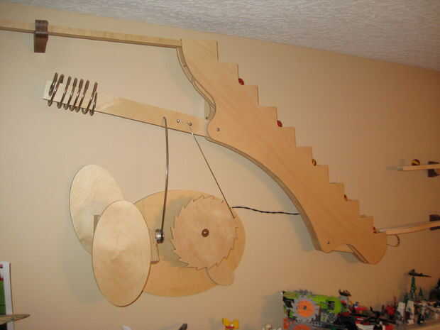 Esta pista está construida principalmente de madera y utiliza canicas de vidrio de 1 pulgada. Hay dos dispositivos de elevación utilizados para traer las canicas a la parte superior de la pista y mantenerlos en movimiento alrededor de la habitación. Los dispositivos de elevación van con paquetes de baterías con baterías AA y pequeños motores de engranaje.