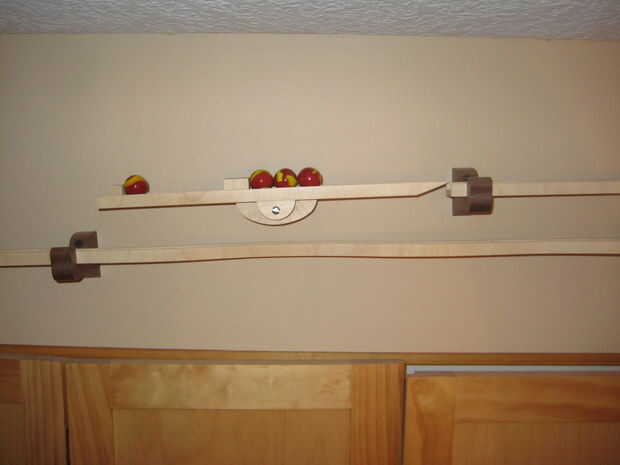 Puede que desee hacer un pedacito de muestra la pista para averiguar la mejor pendiente de la pista alrededor de la habitación. Si la pendiente es demasiado plana entonces los mármoles pueden tener una tendencia a detener o colgar en la pista. Si la pendiente es demasiado empinada los mármoles pueden ir demasiado rápido y saltar fuera de la pista cuando llegan a una curva o una pequeña protuberancia (como un empalme entre piezas de pista). Mi canción tiene una pendiente promedio de aproximadamente el 3,5%. Algunas secciones son un poco planas y algunos son un poco más.