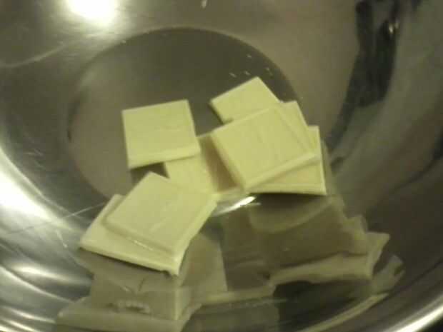 Derretir el chocolate blanco sobre una doble parrilla y para salpicar sobre la guirnalda terminada con un tenedor.