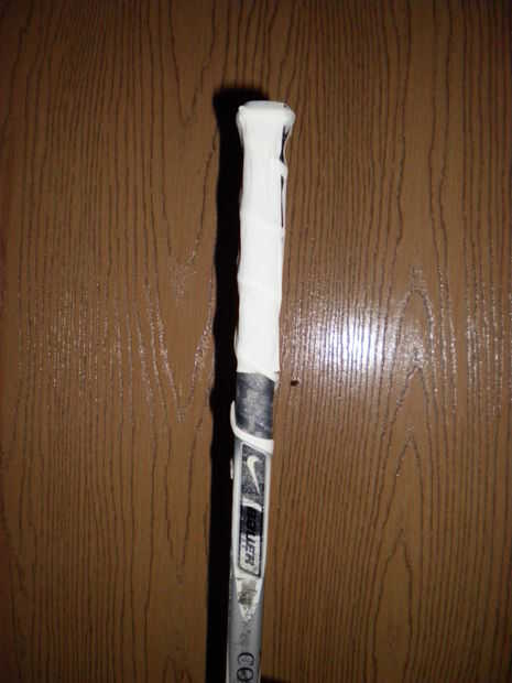 Cortar un trozo de cinta que es de aproximadamente ocho pulgadas de largo y se coloca encima el extremo del palo. Presione firmemente la cinta hacia abajo en los dos lados del palo que toca la cinta. Repita este proceso, excepto que los otros dos lados del palo de hockey para que la parte superior del palo está completamente cubierta.