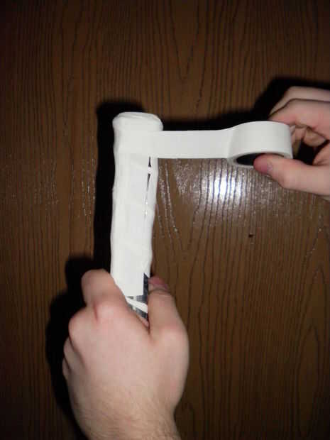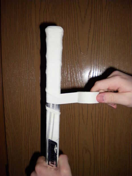 Después de haber grabado las empuñaduras para la palanca, estarás listo para realmente la manija de la cinta. Comience con la cinta como cerca de la cima de los apretones de la manija como usted puede. Lentamente desenrolla la cinta haciendo revoluciones alrededor del palo, cubriendo las asas de cinta que hiciste anteriormente. Continúe abajo del eje del palillo del hockey totalmente han cubierto los mangos con una sola tira de la cinta. Cuando haya llegado a la parte inferior, hacer una más completa revolución mientras nivelando hacia fuera de la cinta por lo que es paralelo al piso. Después de esta revolución y los puños están cubiertos, cortar la cinta y termines con la manija del palillo del hockey.
