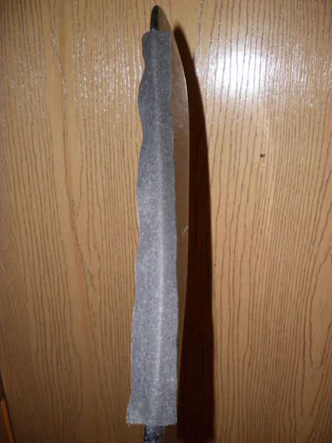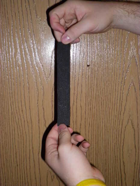 Colocar la blanca cinta del camino y agarra el rollo de cinta negra de hockey. Cortar un trozo de cinta negra del hockey que es de aproximadamente seis pulgadas de largo. Toma este pedazo de cinta adhesiva y Coloque longitudinalmente en la parte inferior de la hoja desde el talón de la hoja hacia la punta. Asegúrese de que la hoja esté en medio de la cinta para toda la longitud de la pieza de la cinta. Presione los lados de la pieza de la cinta firmemente sobre la hoja para que no se mueve.