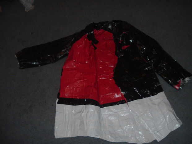 Establecer largo tira de pegamento de la cinta del conducto, en la mesa de plástico suave. Pone más tiras de borde sobre borde así que tiene una hoja en la mesa de plástico. Pelar la hoja encima y colocar adhesivo hacia arriba. Cubrir con otro adhesivo hoja adhesiva. Asegúrese de que la hoja es grande y puede cubrir el lado de la cintura hasta los hombros. Repita el proceso para hacer el otro lado de la chaqueta.