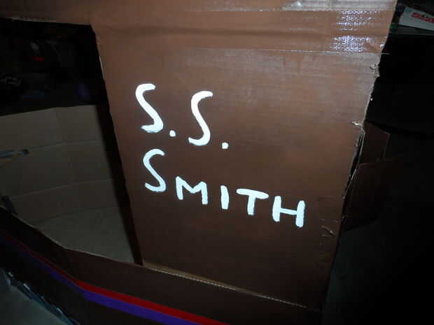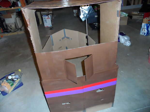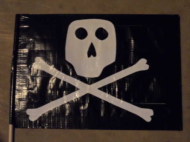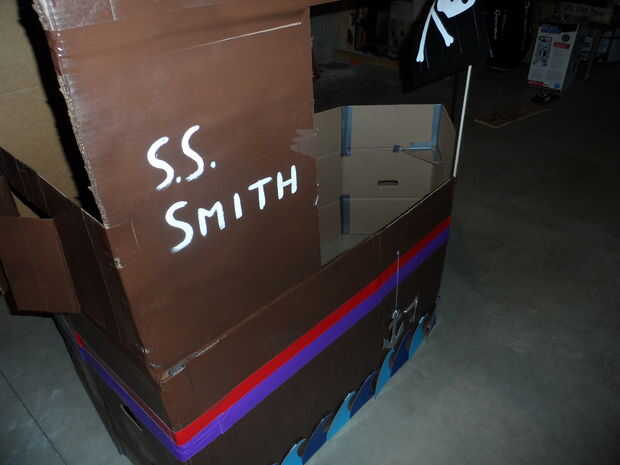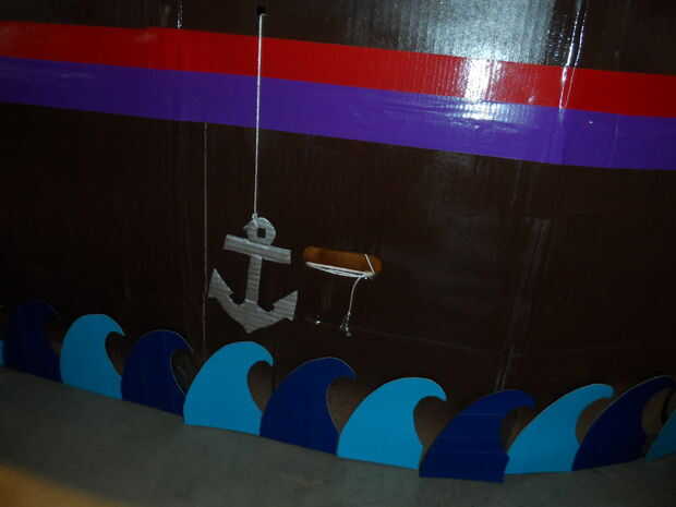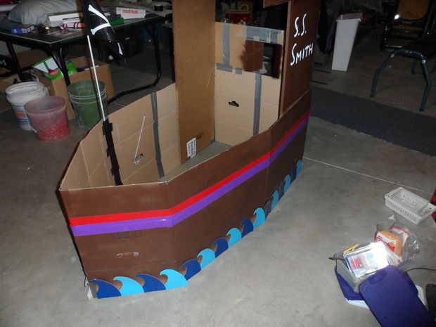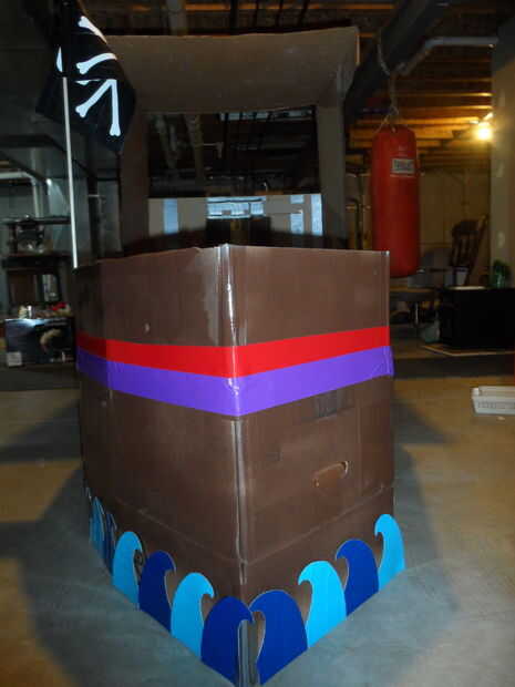 Mi amigo y yo hecho un barco de cartón y cinta adhesiva para el hijo de mi primo para su cumpleaños. Nos aerosol pintado el barco marrón y anclaje de la plata, de lo contrario, todo es cartón o conducto de cinta (excepto el poste de bandera, que es de madera).