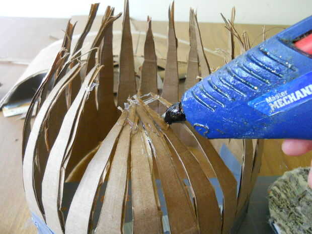 OK ahora pegamento caliente los extremos de todos los puntos juntos como se muestra, tratan de mantener a todos hacia el centro pero hacen ligeramente ovalada por lo que cabe en la cabeza.