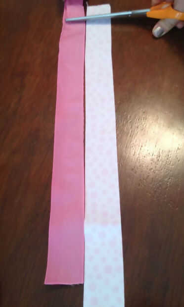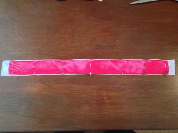 Coincida con la cinta de terciopelo hasta la cinta decorativa y cortar aproximadamente una pulgada más corta que la cinta decorativa. A continuación, toque cintas pin los 2 juntos para que el lado terciopelo y decorativos enfrentan hacia el exterior y los lados mates