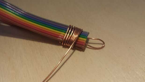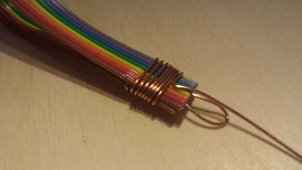 Tome la longitud de alambre que fue "leerlo hacia fuera" entre los extremos del cable de cinta y doblar en forma de bucle metiendo el extremo entre los extremos del cable de cinta. A continuación, doblarlos el otro extremo de las sobras de hilo de cobre de envolver para arriba en un ángulo recto, como se muestra. Llamaré este fin el "extremo libre" en el siguiente paso.