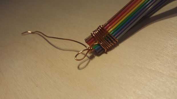 Envuelva el extremo libre del alambre alrededor del lazo que acababa de formar y remeta el extremo libre entre los extremos del cable de cinta también. Para mayor seguridad, puede enhebrar el extremo libre en la última cinta cable-envoltura antes de hacer las envolturas de lazo, como lo hice.