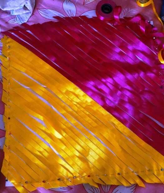 En este diseño, se toma un rollo de cinta y a partir de un extremo diagonal y otro color de opuesto extremo hasta el centro. (ver imágenes)
