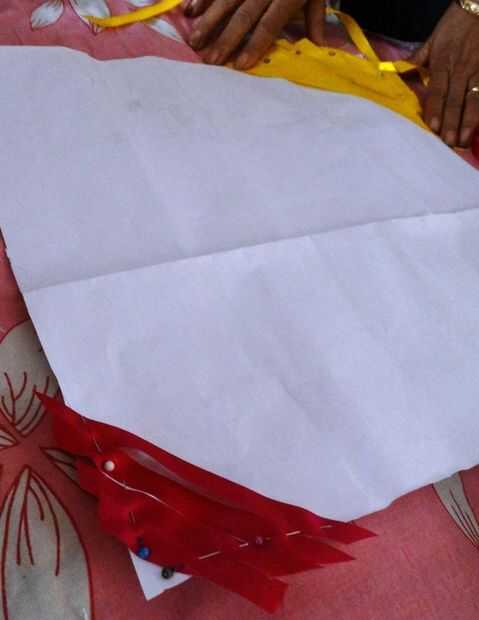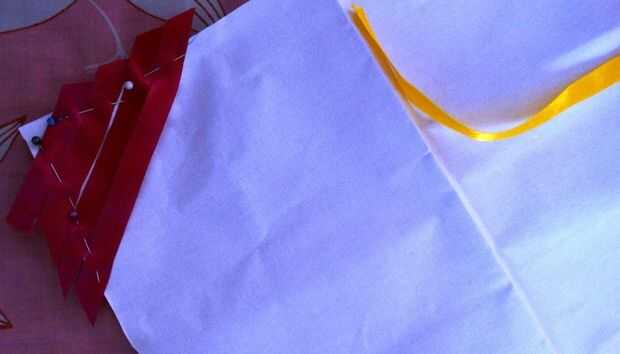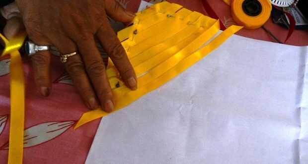 Comenzar fijando y cortar las cintas a partir de final diagonal como se muestra en la imagen (medida a lo largo de la lona, mantener el tamaño de poco más de tela de la cinta).
