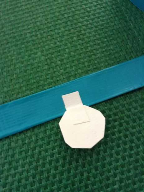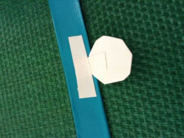 Cortar una pequeña tira de cinta adhesiva y cortar un pedazo pequeño y una pieza larga. Use el pedazo pequeño para sujetar el círculo al collar. Y el pedazo largo para sujetarla.