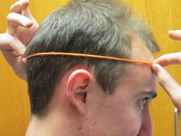 Sujetar un lado del hilo sobre su sien derecha y estirar el hilo en la parte posterior de su cabeza con la otra mano.