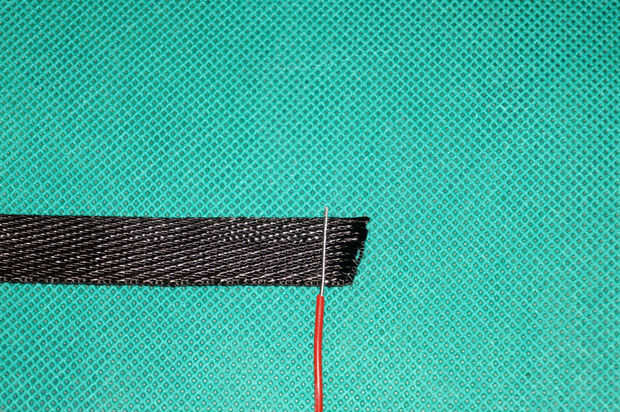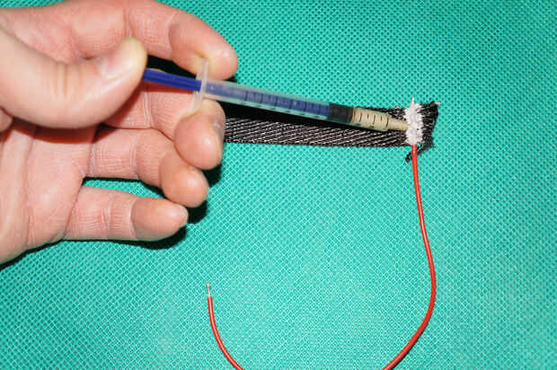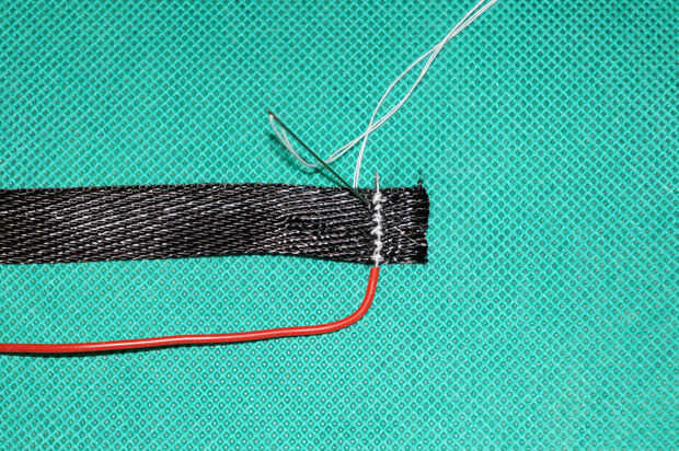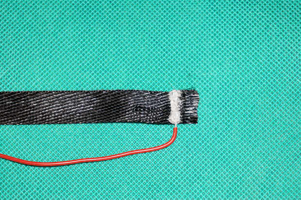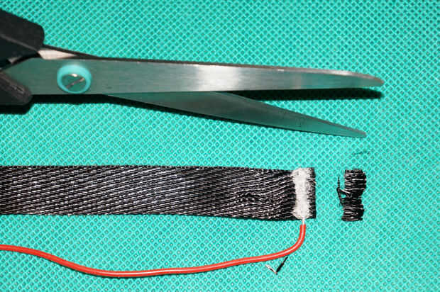 Fijar cables en la cinta de carbón. Un cable en el centro y dos alambres en los bordes. Los cables tienen que pegar con un adhesivo conductor de plata. Para su comodidad, le recomendamos que coser la cinta al alambre y entonces aplicar una cola de plata.