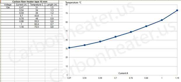 La temperatura depende de la tensión de la batería y la longitud de la cinta. Hicimos unos 45 grados. Necesita 2 pies de cinta de carbono de 15 mm solamente.