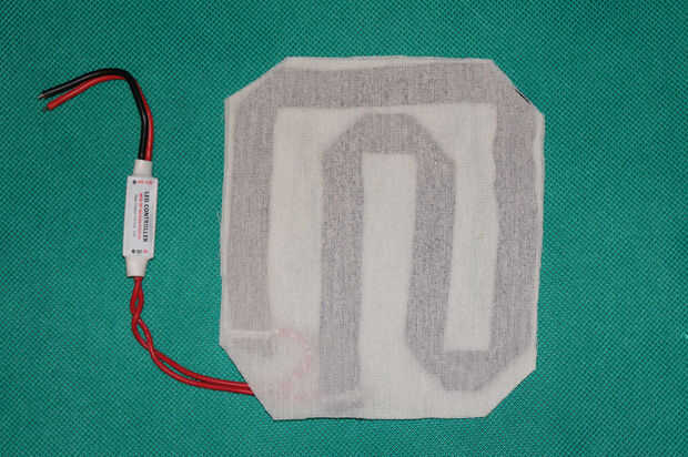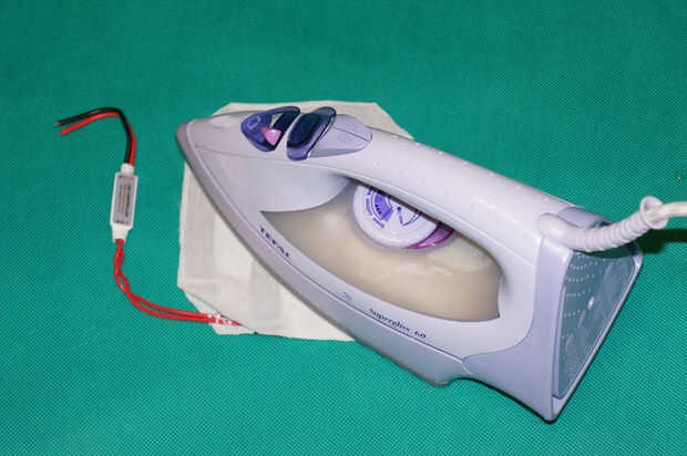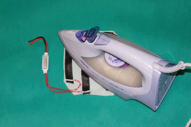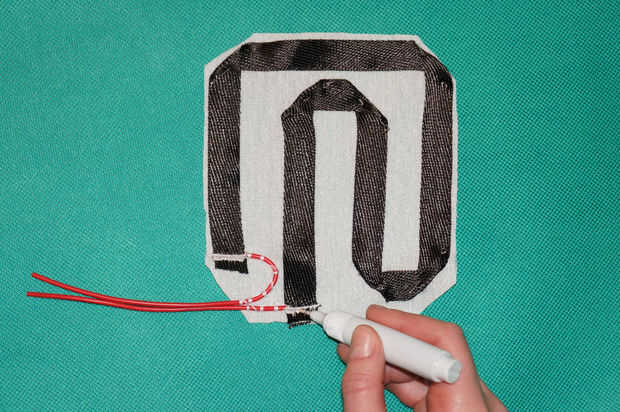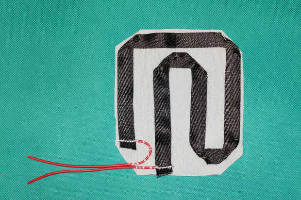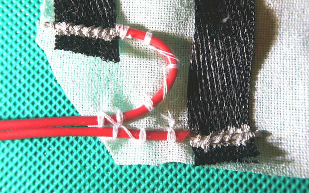 Pelar los cables y coserlas como se muestra en la foto. Aplique un pegamento plata. Espere 5 minutos y aplicar el pegamento para hacer contacto más fiable. Suavemente la cinta de carbón de hierro. Poner en la segunda pieza de la tela y fijar el paquete con hierro o a coserlo.