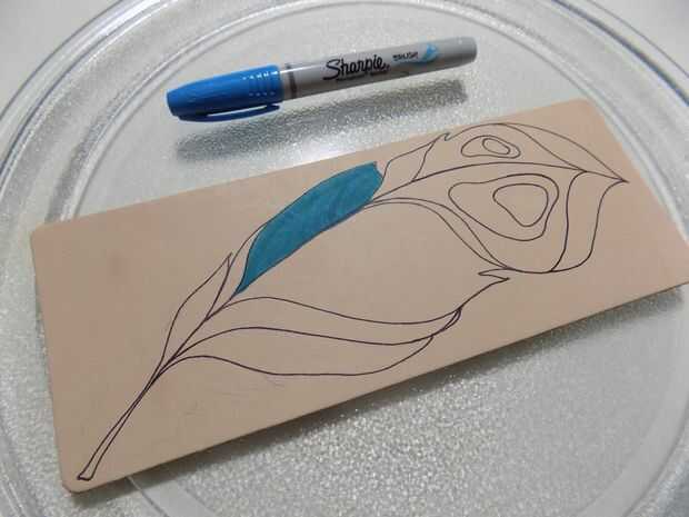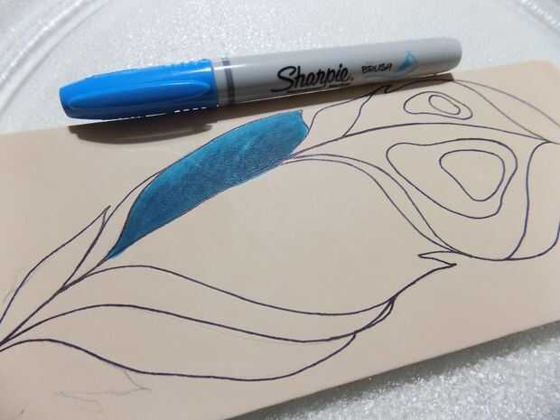 Traza el diseño con marcador permanente y cualquier área que no desea sangrado del color. Opté por comenzar en el medio, por lo que yo pude mezclar el color intermedio en los colores en cada extremo. El marcador no se sangra cuando el alcohol se agrega, pero será más difícil de utilizar una vez que usted ha rociado hacia abajo porque la punta se absorber el alcohol.