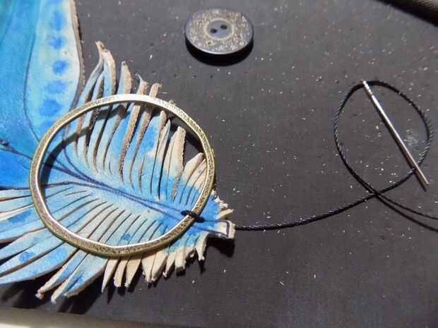 Coloque los accesorios de la misma manera se une el cuero de la tira en el paso anterior, aunque puede que necesite ir a través de los agujeros de más de una vez. Me cosidas en el aro del metal y luego volvió para fijar el botón.
