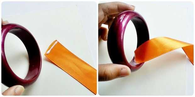 Comience envolviendo la cinta del satén alrededor de la pulsera uniformemente.