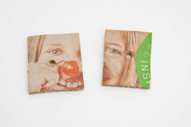 Para colgarlos a la pared, cortar dos piezas de cartón y hacer un agujero en el centro y pegar en las esquinas superiores.