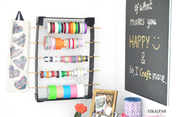 Pintarlas en el color de su elección. Corte la madera clavijas cada una mide 20 pulgadas. (Clavijas de madera fueron 48 pulgadas). Y también pintar. Una vez seca la pintura. Usted está listo para usar tu creación maravillosa!. Organizar tus carretes de cinta y cintas en su nuevo organizador y se sorprenderá.