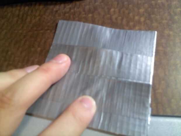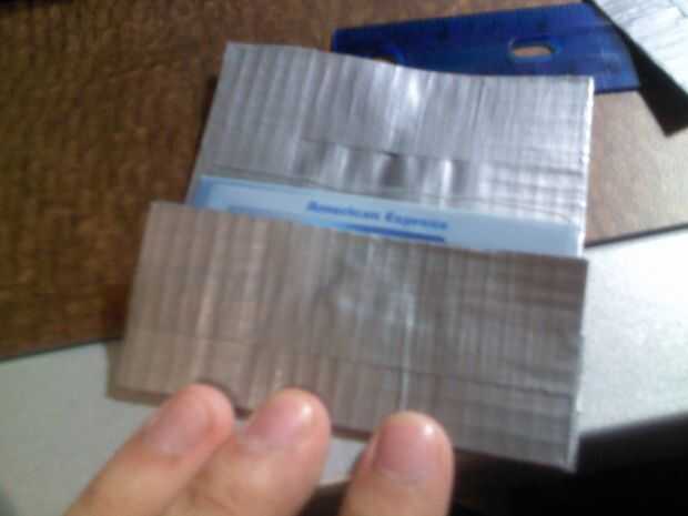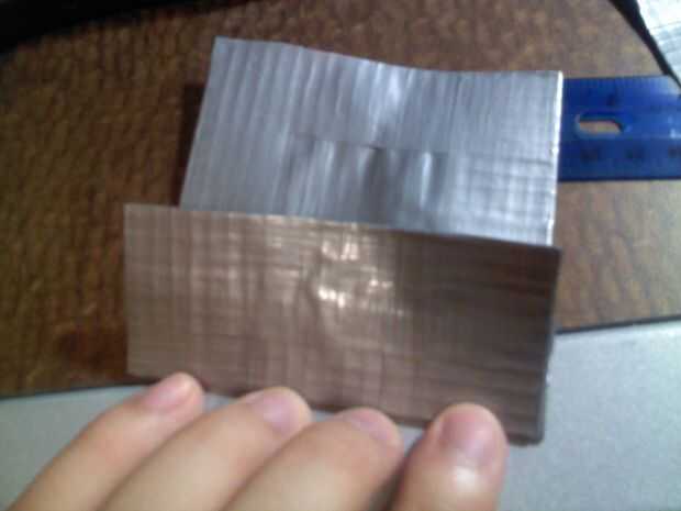 Con la otra pieza pequeña, coloque detrás de la tapa frontal para hacer el segundo bolsillo, lugar para que la tarjeta no viene hacia fuera de la parte superior. Luego tiras de cinta con 3.5" parte delantera y trasera. Repita estos pasos con la otra. Ahora debe tener dos piezas cuadradas con dos aletas sobre ellos.